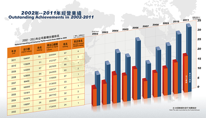 近年來,公司發(fā)展勢頭良好, 2014年公司實際出口額達到10.5億美金,排名“2014中國出口200強”第192名,其中民營企業排名第21名。公司先后獲得 “中國守合同重信用企業”、 “廣東省先進集體”、“廣東省優(yōu)秀民營企業”、“東莞市50強民營企業”,“東莞市文明單位”等稱號,公司被東莞市政府授予“東莞市50強民營服務業企業”光榮稱號,公司董事長陳海生被授予“東莞市優(yōu)秀民營企業家”光榮稱號。